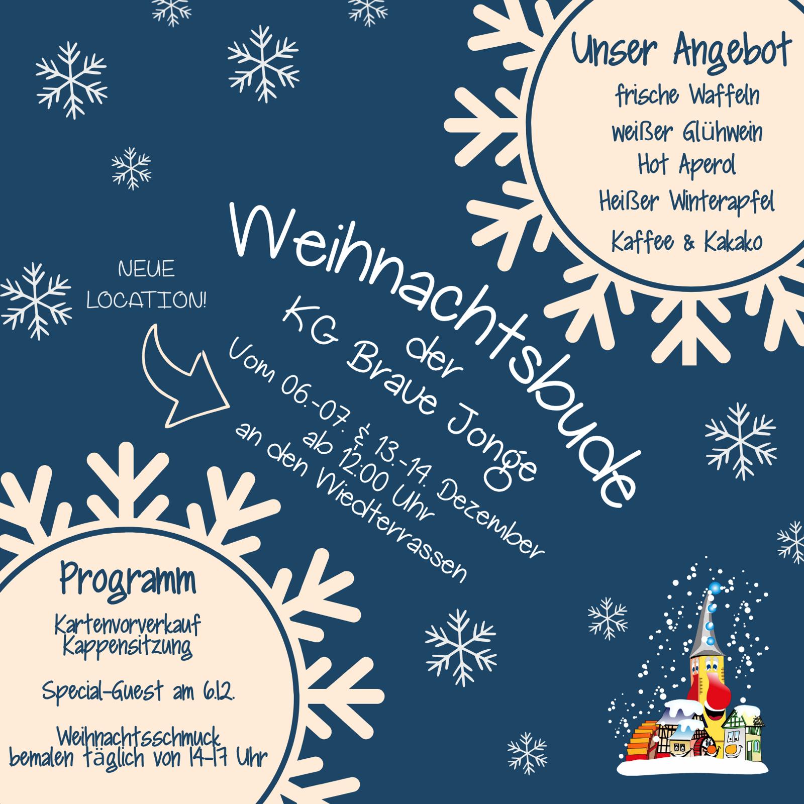 An den beiden Adventswochenenden – dem 2. und 3. Advent – ist die KG Brave Jonge wieder aktiv im Rahmen des Waldbreitbacher Weihnachtsdorfs vertreten. Wie schon viele Jahre zuvor betreibt der Verein eine eigene Weihnachtsbude, diesmal jedoch außerhalb des eigentlichen Weihnachtsmarktes.