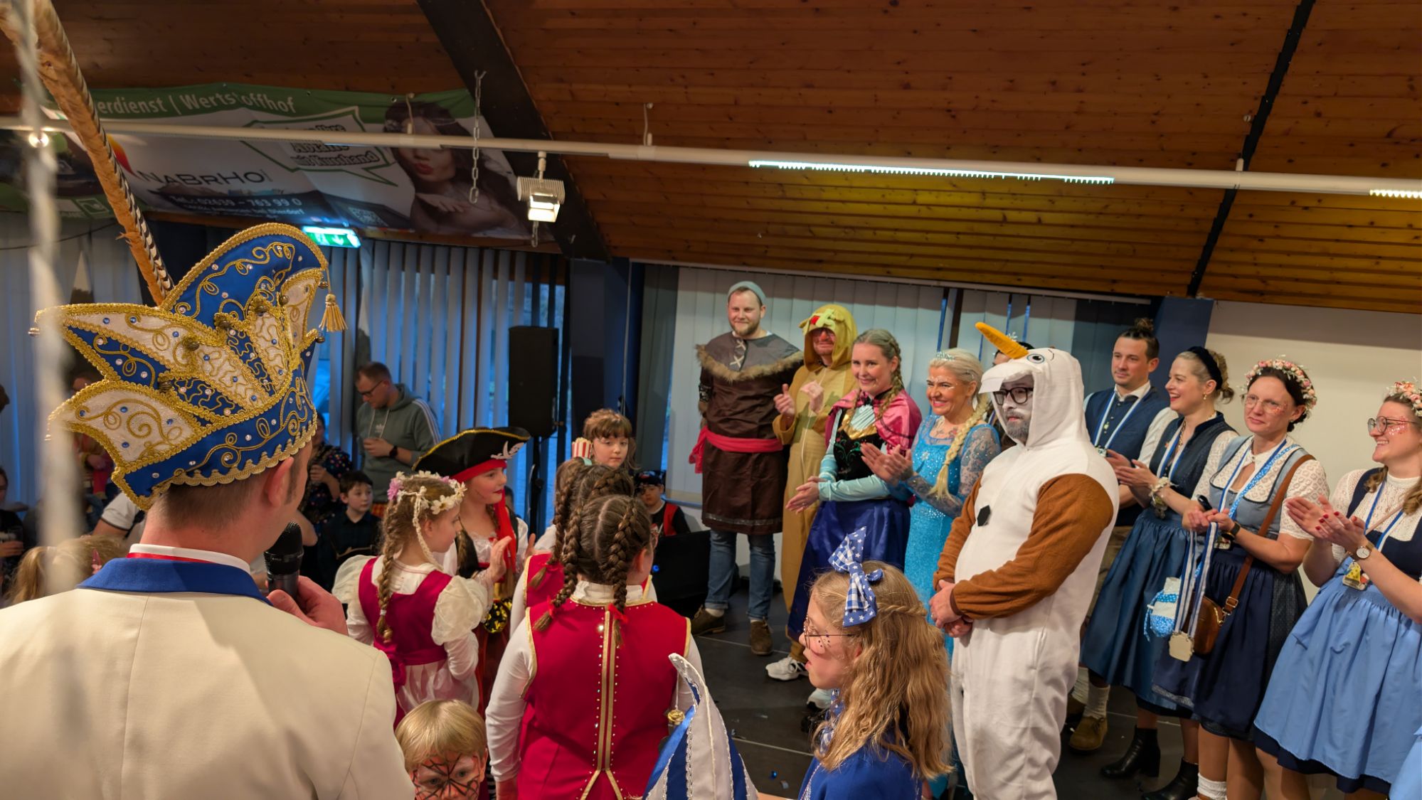Zum Abschluss des Kinderkarnevals wartete noch eine besondere Überraschung: Zunächst betraten das Prinzenpaar der KG Brave Jonge, Dodo I. und Anne I., als Eiskönigin und Schneemann Olaf die Bühne und sorgten mit ihrem tänzerischen und schauspielerischen Auftritt für große Begeisterung. Währenddessen zogen der Hofstaat sowie die Erwachsenen der KG Brave Jonge in den Saal ein und ergänzten den stimmungsvollen Auftritt.