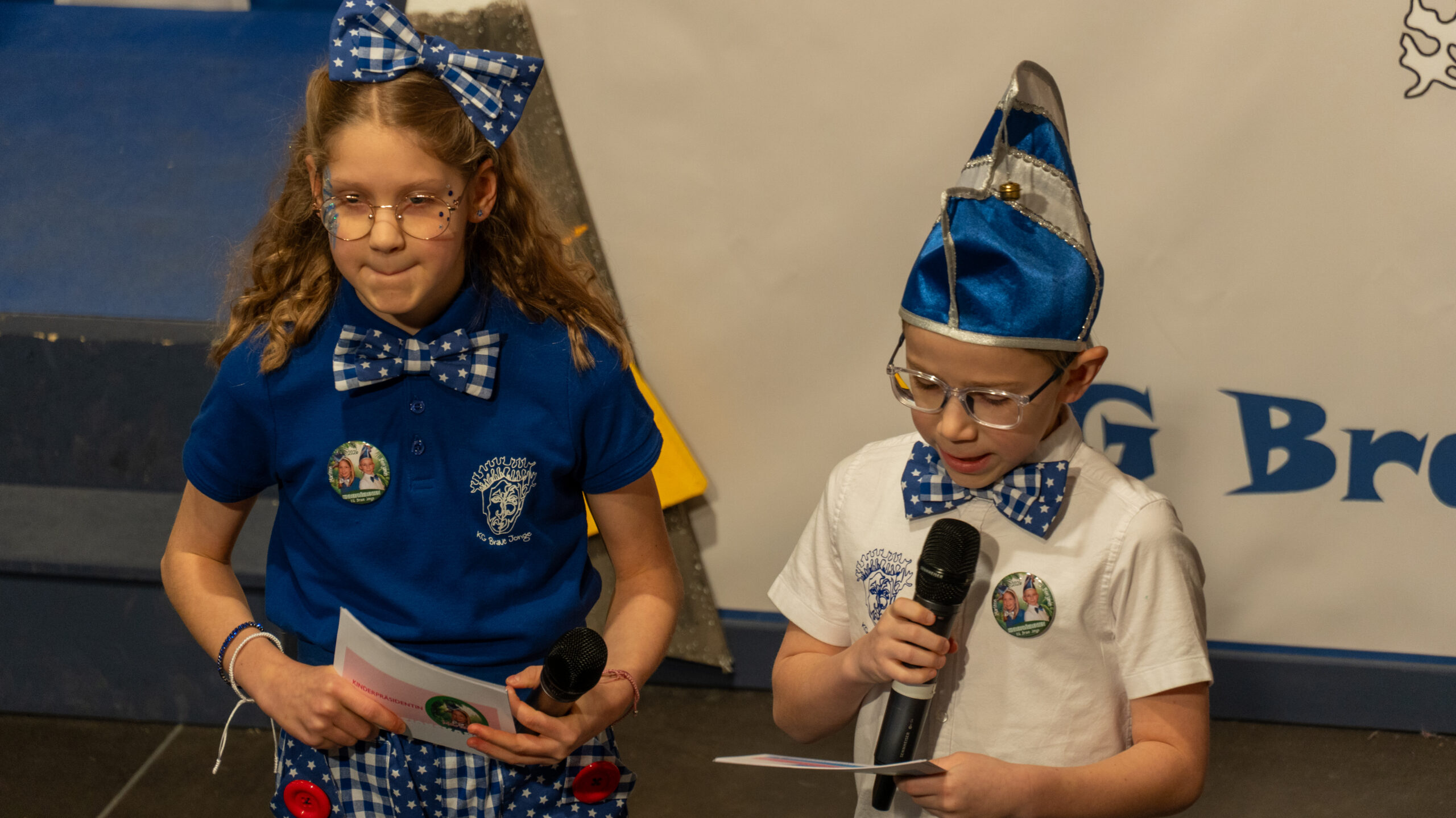 Pünktlich um 14:11 Uhr begann der Einzug der Tanzgruppen der KG Brave Jonge. Die Minifunken, Kindergarde und Jugendgarde zogen, gefolgt vom Kinderelferrat sowie den beiden Kinderpräsidenten, in den Saal ein. Begleitet wurde der Einmarsch von reichlich Kamelle, die begeistert in die wartende Kinderschar geworfen wurden. Anschließend begrüßten Marlene und Benjamin das Publikum und eröffneten offiziell das Programm.