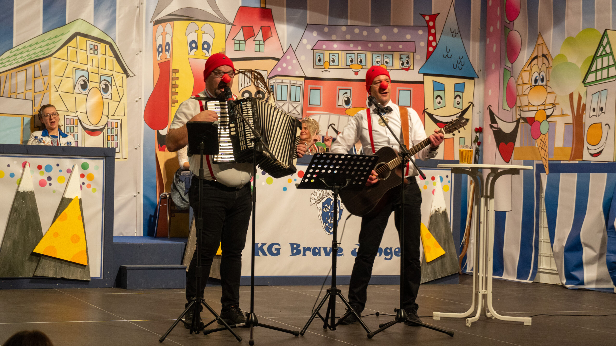 Im Anschluss zeigten die Dreamboys, das Männerballett des Bräpe Karnevals, ihren Tanz, der in diesem Jahr besonders schwungvoll, humorvoll und perfekt einstudiert war und das Publikum restlos begeisterte. Musikalisch folgte ein weiterer Höhepunkt mit Präsident Faxe und Präsident Basti, die als „Zwei Dulle von de Baach“ für viele Lacher und Mitsingmomente sorgten. Danach wurde eine 15-minütige Pause eingelegt.