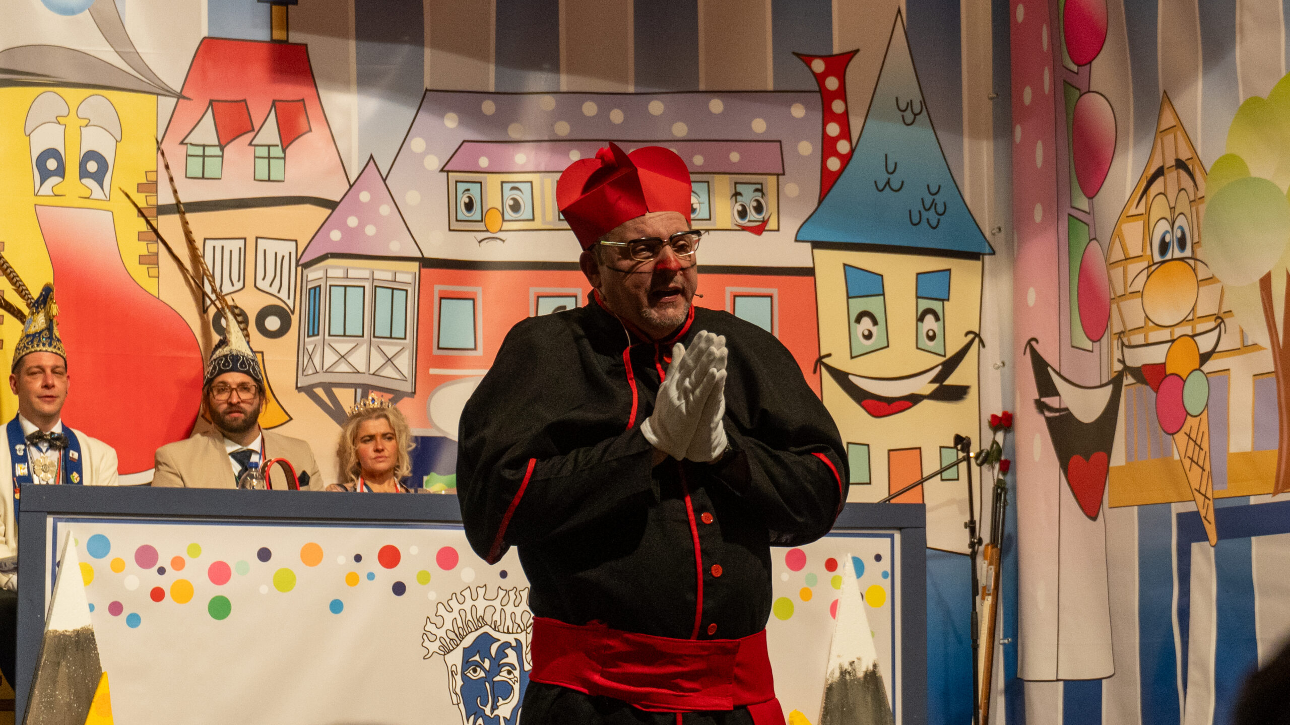 Nach der Pause betrat Gerhard Rams erneut die Bühne – diesmal in der Rolle eines Priesters. Seine Büttenrede war ein echtes Glanzstück des Abends: Mit pointierten Beobachtungen, feinem Humor und treffsicheren Seitenhieben brachte er das gesamte Kolpinghaus zum Lachen und erhielt dafür langanhaltenden Applaus.