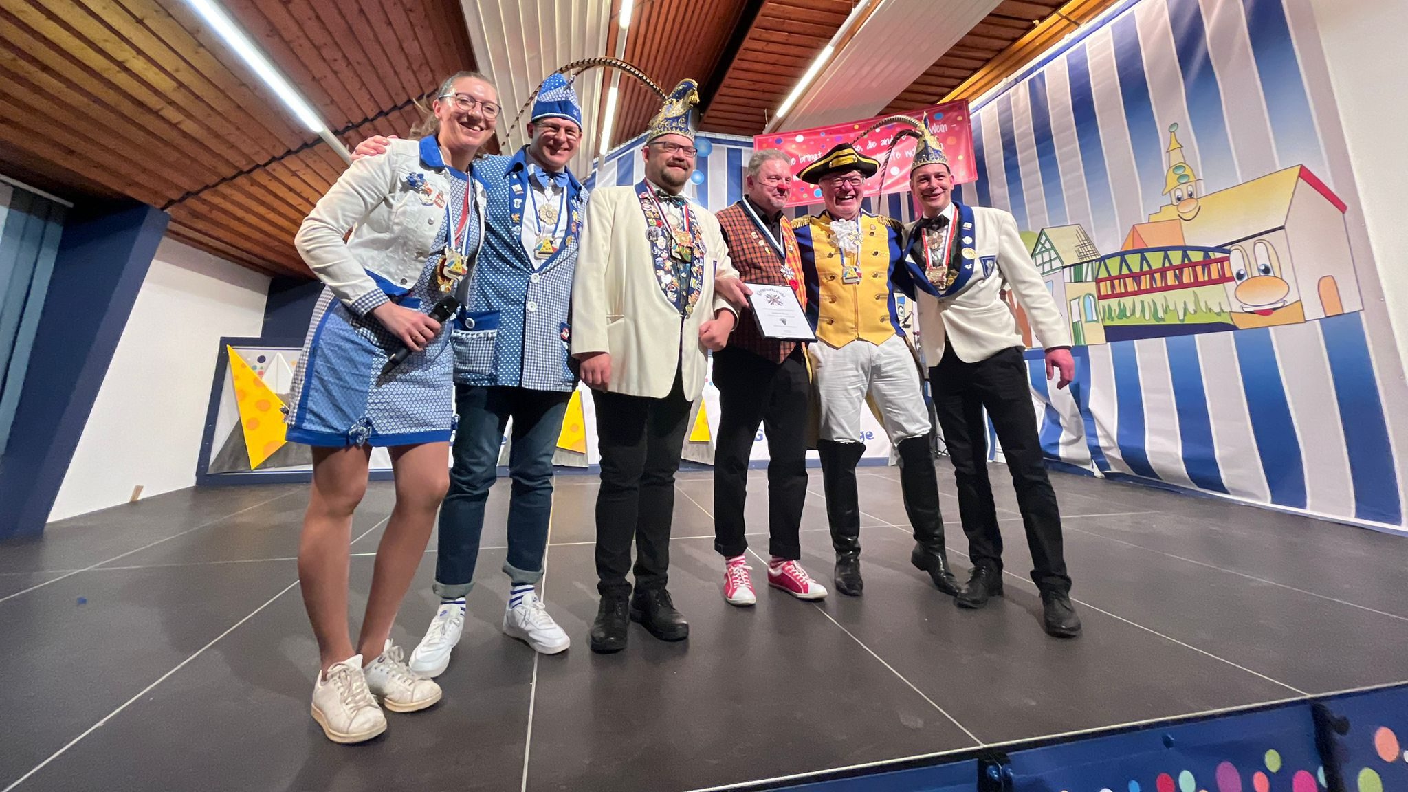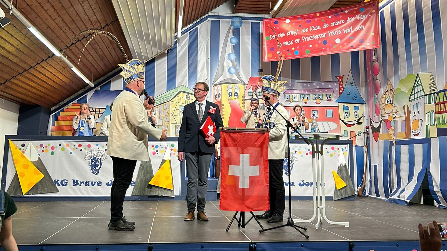 Für eine echte Überraschung sorgte der anschließende Vortrag des Hofstaates: Max Hartmann schlüpfte gekonnt in die Rolle von Florian Silbereisen und moderierte einen karnevalistischen Abend der Volksmusik. Mit viel Wortwitz rief er Künstler und Attraktionen aus der Schweiz – dem Heimatland des Prinzenpaares – auf die Bühne, die vom Hofstaat mit großem Humor und Spielfreude dargestellt wurden.