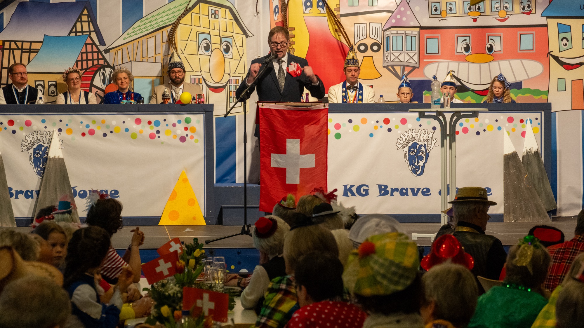 Das abwechslungsreiche Programm eröffnete Michaels Rams, der als Schweizer Botschafter aus dem Rheinland auftrat. Mit humorvollen Gegenüberstellungen von Schweizer und rheinischen Bräuchen sorgte er für viele Lacher im Saal.