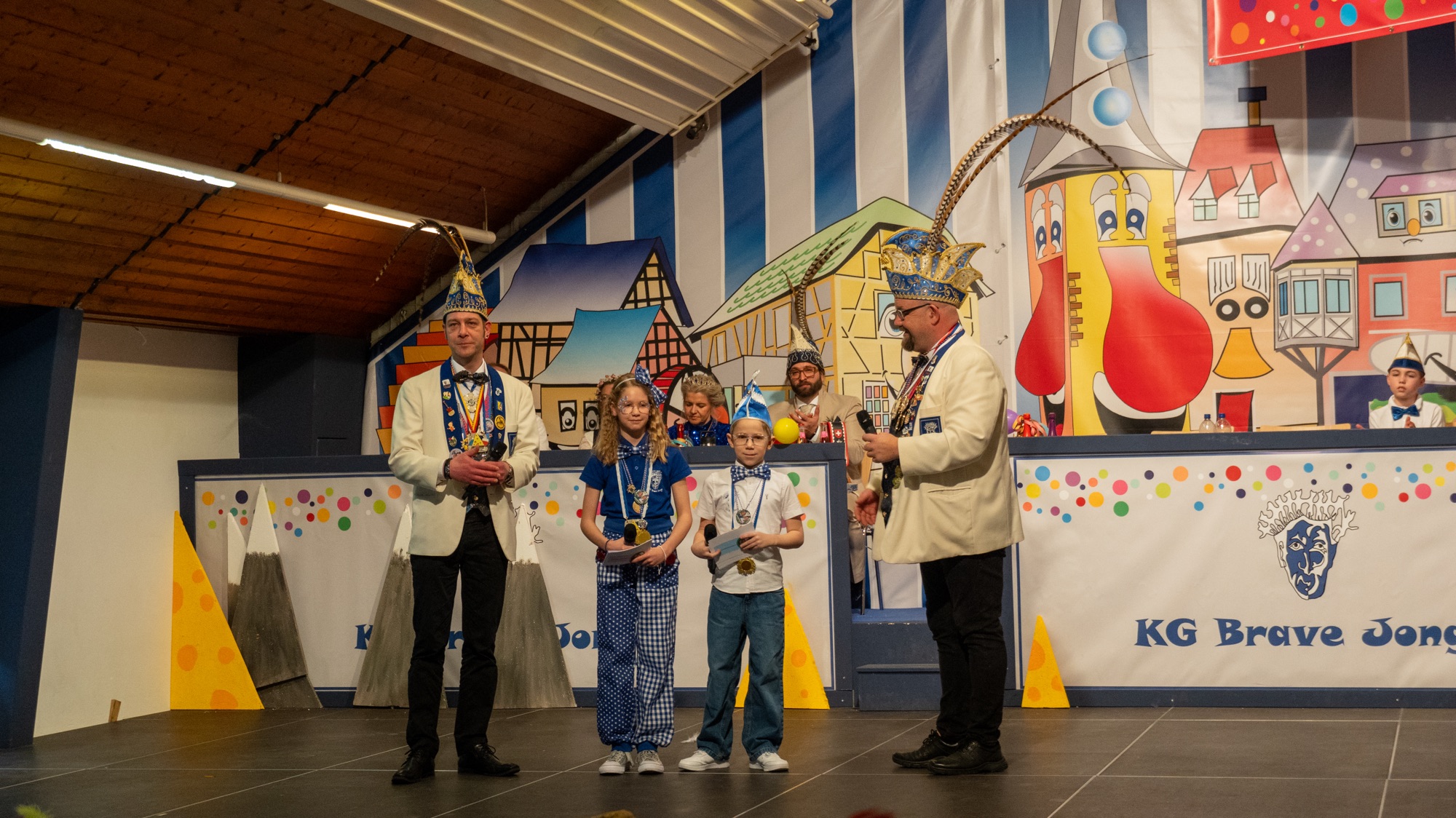 Anschließend gehörte die Bühne dem karnevalistischen Nachwuchs. Die Minifunken präsentierten ihren Sessionstanz. Es folgte der Auftritt von Luis und Frieds, der für besondere Heiterkeit sorgte: Hinter einem Vorhang steckten die Kinder ihre Köpfe und Arme hindurch, während mit Fäden befestigte Beine für witzige und teils akrobatische Bewegungen sorgten. Durch den abwechslungsreichen Wechsel von Musik und passenden Accessoires entstand eine kreative und sehr humorvolle Darbietung, die vom Publikum mit viel Applaus belohnt wurde.