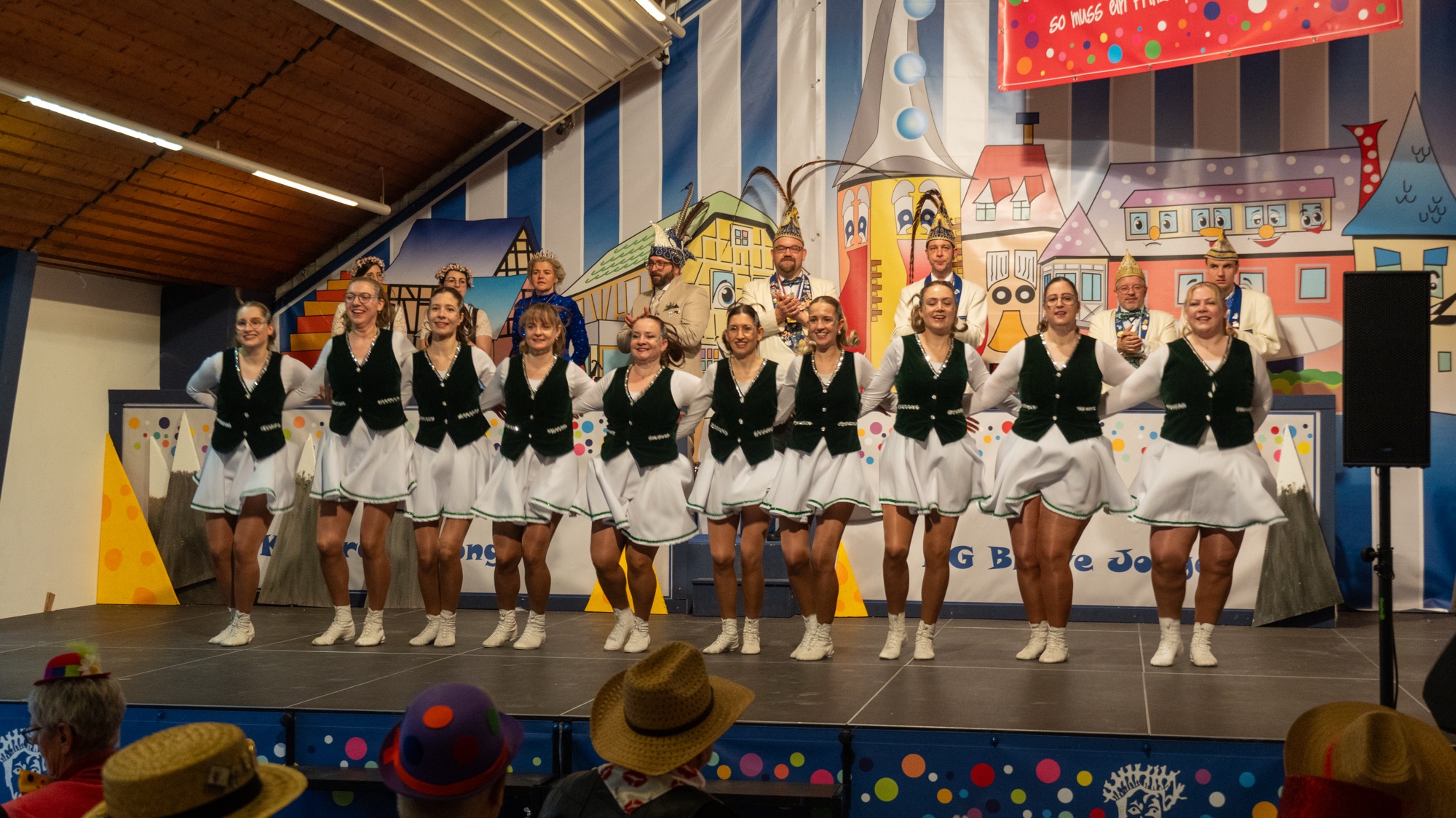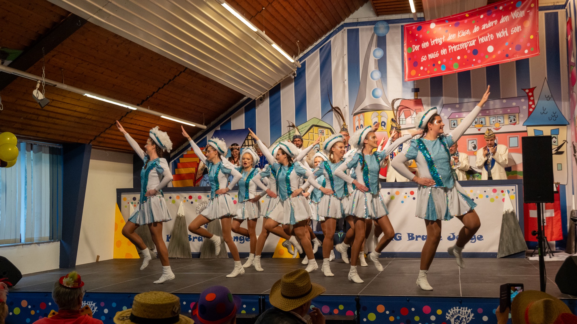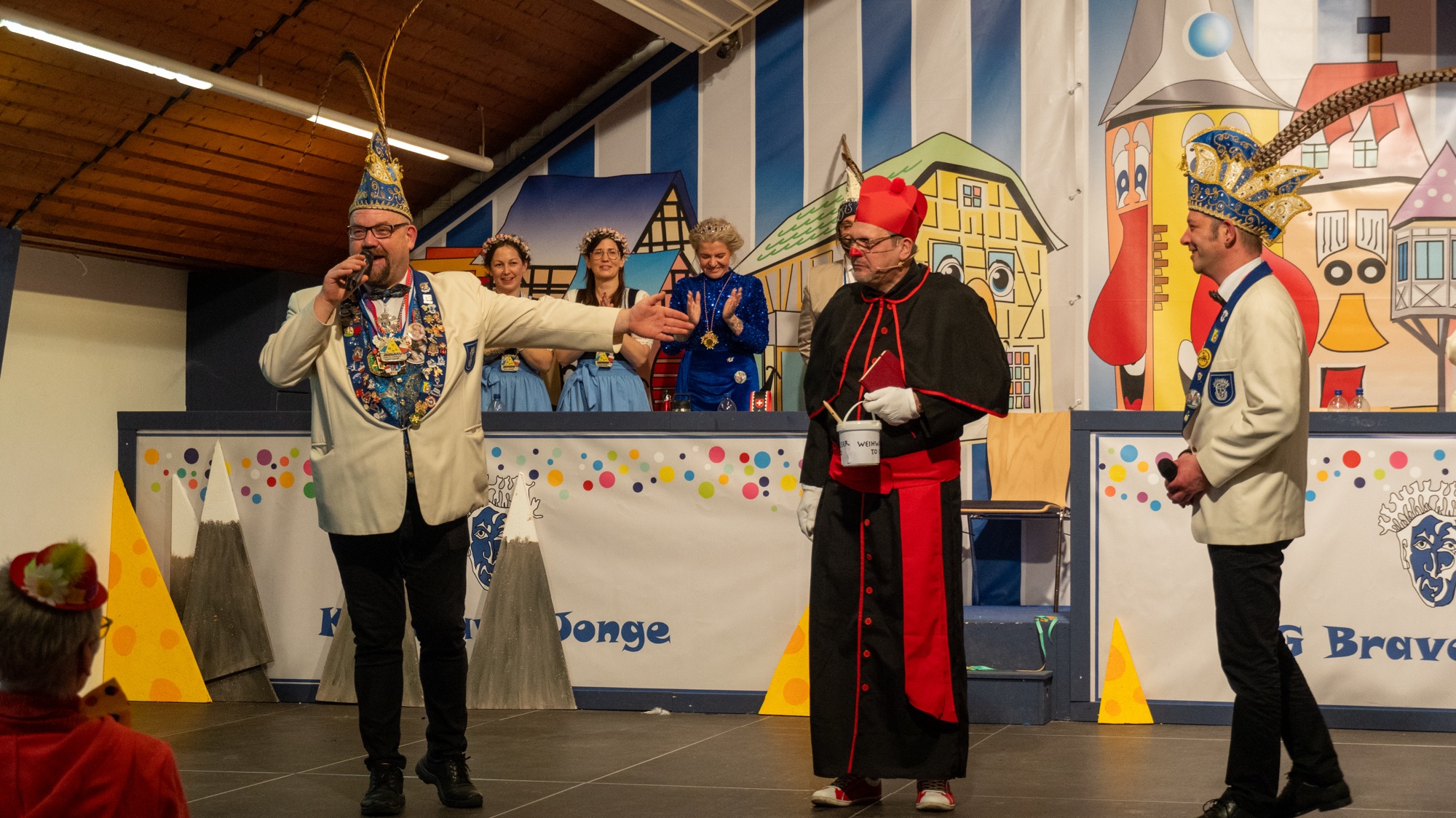 Musikalisch sorgten anschließend Präsident Basti und Präsident Faxe als „Zwei Dulle von de Baach“ für beste Unterhaltung mit musikalischen Witzen. Es folgte der Tanz des Männerballetts „Dreamboys“, der das Publikum mit viel Humor begeisterte. Danach trat Gerhard Rams als Kardinal auf. Sein im Kirchenstil gesungener Vortrag erinnerte an Kantillation und sorgte mit dieser besonderen Mischung aus Gesang und Witz für viele Lacher und anerkennenden Applaus.