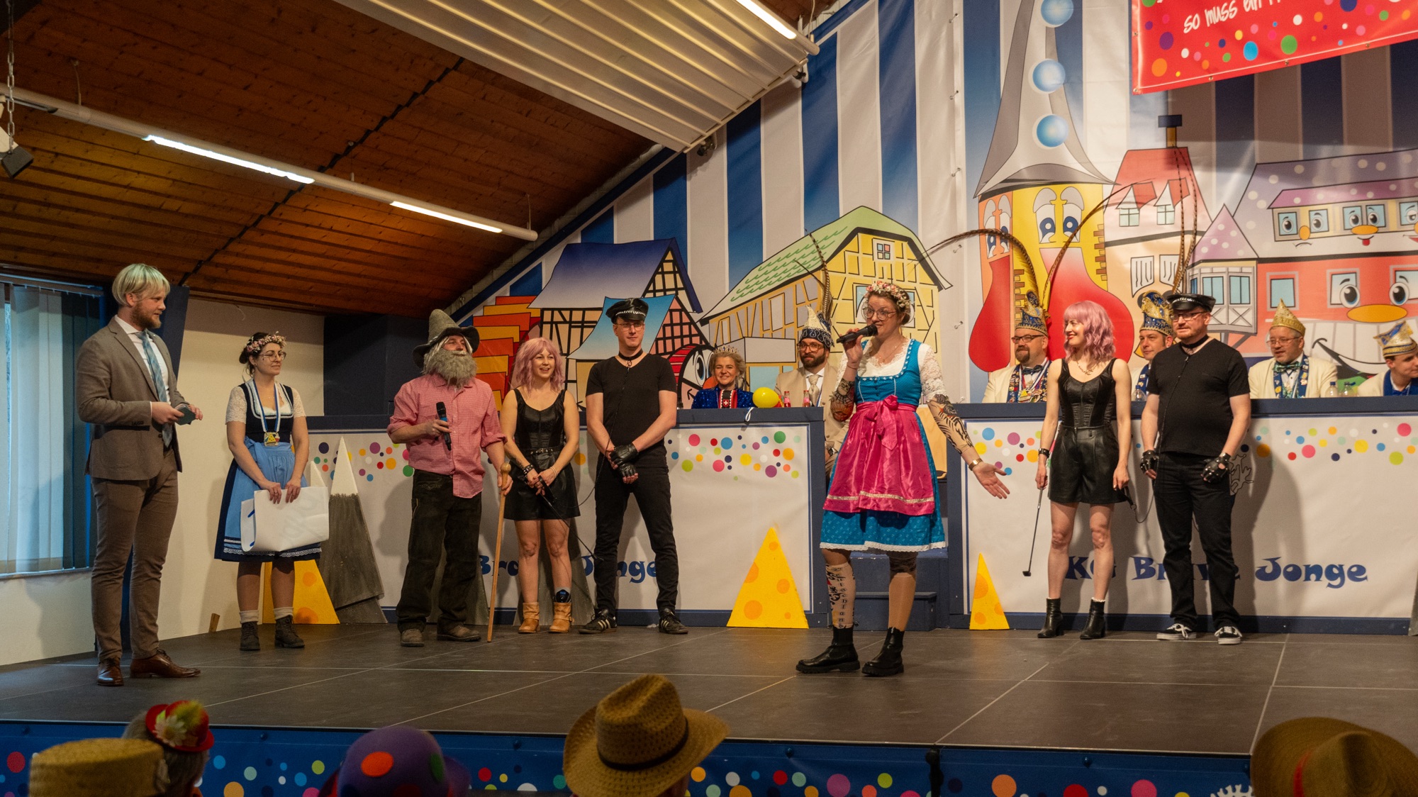 Ein weiterer Höhepunkt folgte mit dem Auftritt des Hofstaats: Max Hartmann schlüpfte gekonnt in die Rolle von Florian Silbereisen und moderierte einen karnevalistischen Vormittag der Volksmusik. Mit viel Wortwitz rief er Künstler und Attraktionen aus der Schweiz – dem Heimatland des Prinzenpaares – auf die Bühne, die vom Hofstaat mit großer Spielfreude und Humor dargestellt wurden.