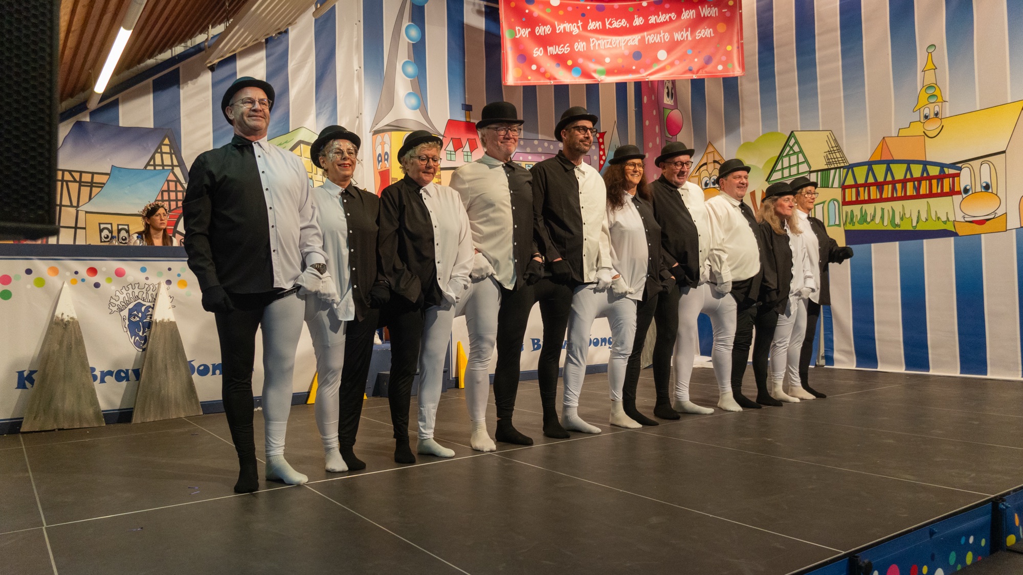 Einen weiteren tänzerischen Höhepunkt bildete der Auftritt der Tanzgruppe „Schwarz/Weiß“, bestehend aus langjährigen Karnevalisten des Bräpe Karnevals. Mit ihrer außergewöhnlichen, kreativen und äußerst humorvollen Darbietung ernteten sie großen Applaus. Moderiert wurde dieser Programmpunkt sowie die folgenden Beiträge von Michael Beyer und Oliver Theobald.